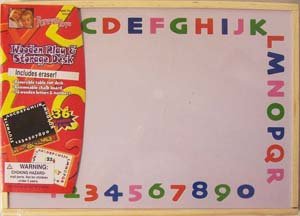 This Magnetic Letters & Number Play and Storage Desk features reversible table top desk, removeable chalk board, 2 chalk, 1 eraser, and 2 crayons and 36 magnetic letters & numbers. Great educational toy to learn your alphabet & numbers and have fun too! Dimensions: L 14 3/4" x W 1 1/2' x H 10 3/4"