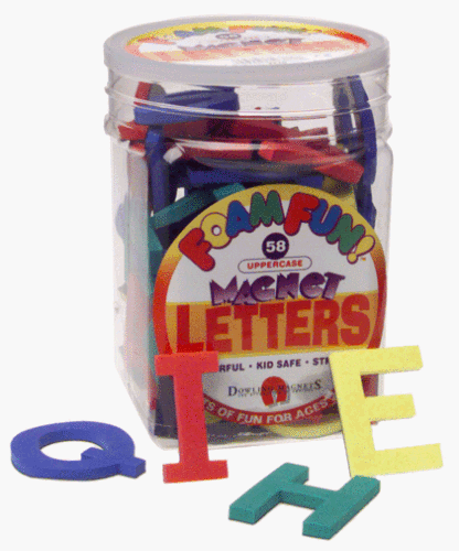 - Includes 58 foam letters, 1.5" - 2" (4cm -5 cm) tall in four colors.